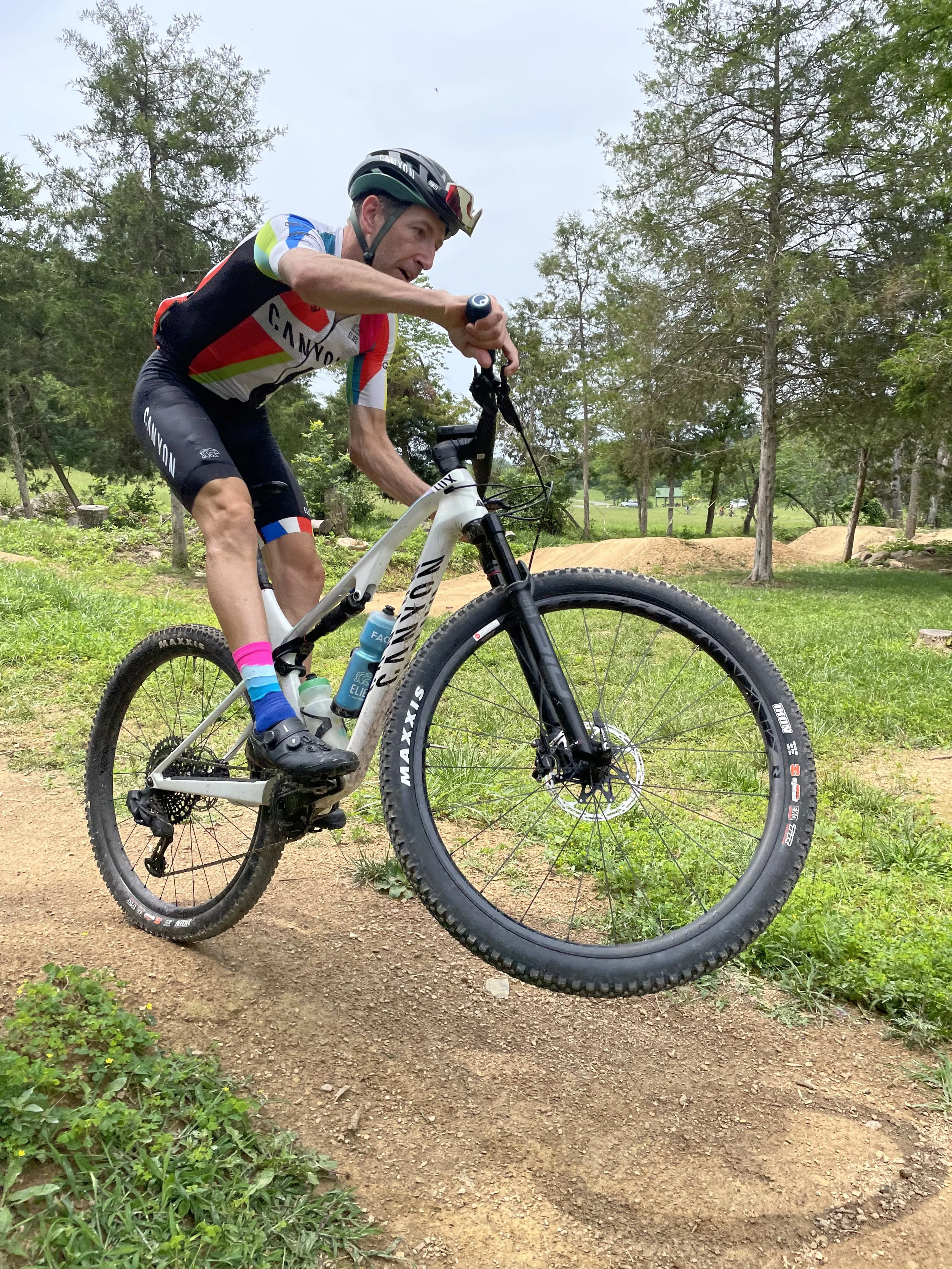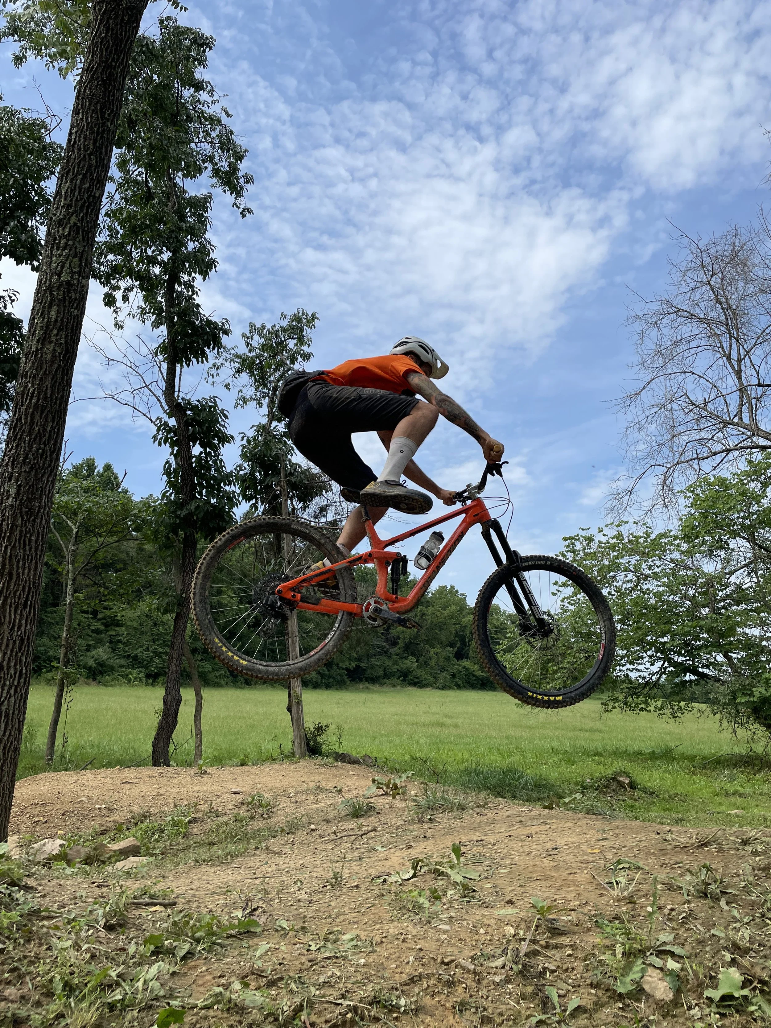 We got to the campsite around noon on Sunday. Went for a ride. Lunch. Skills park with jumps until we get stormed on. 8 person pile up on a berm (everyone was okay). Wait out the storm for 30 minutes under gazebo.