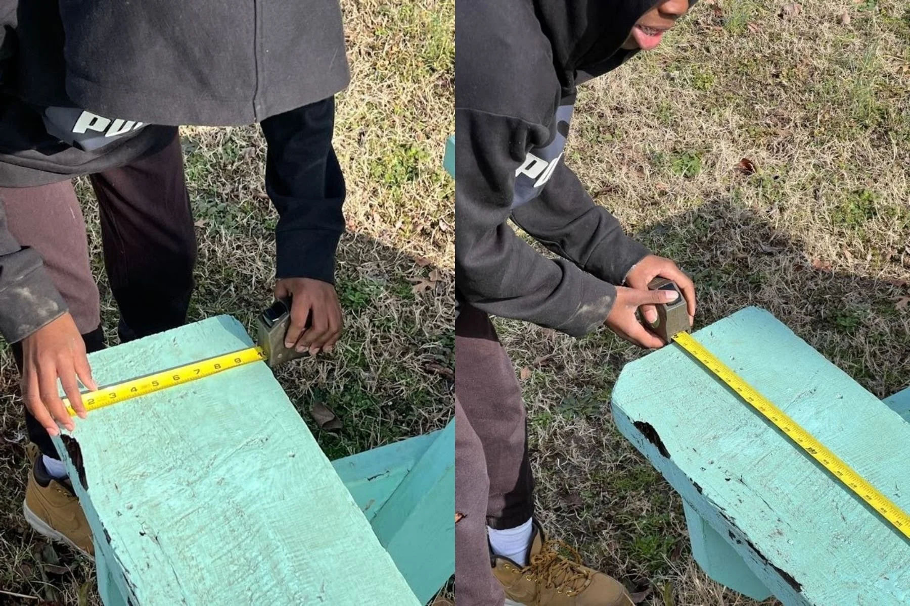 Taking measurements of the broken bench seat board